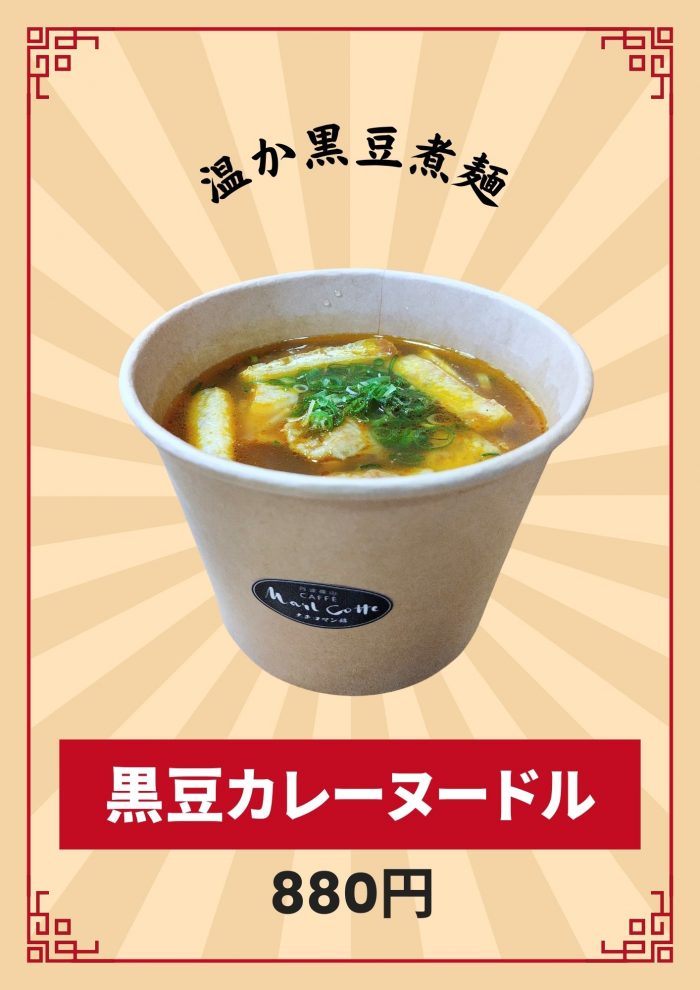 What’s New!!!(新着情報) 出来立て熱々ホットサンド! 販売時間 11:00~16:45 五種類のホットサンド販売中! 1種600円(税込み) ご注文を頂いてからお作りしますので、10分ほどお時間を頂いております。 黒豆カレーヌードル! 販売時間 11:00~16:45 寒い冬にはピッタリの「黒豆カレーヌードル」! 黒豆をたっぷり練り込んだ黒豆素麺とコクのあるカレースープをお楽しみください♪ ご注文を頂いてからお作りしますので、10分ほどお時間を頂いております。